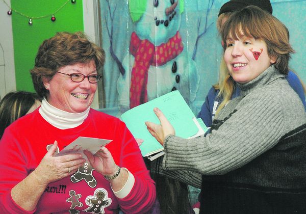 Renee Nied, left, gives concert judge Deb Haslun a reward.