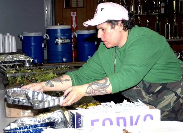 Nanette Hellijas of Cobleskill loads up the tables.