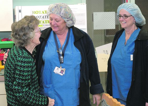 Pat Emmons and Joan Roberts congratulate Aggie Scott.