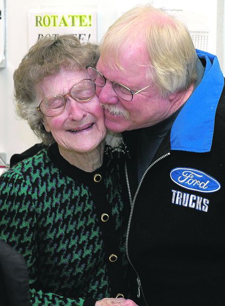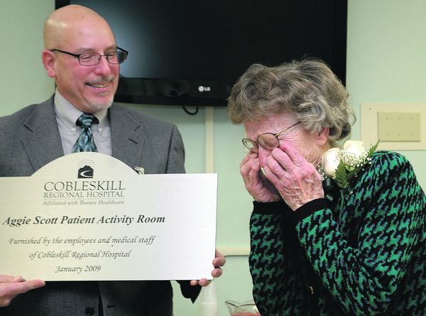 Eric Stein, with a plaque, brings Aggie Scott to tears.