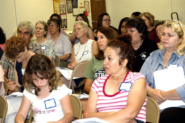 The crowd of would-be canners listens carefully.
