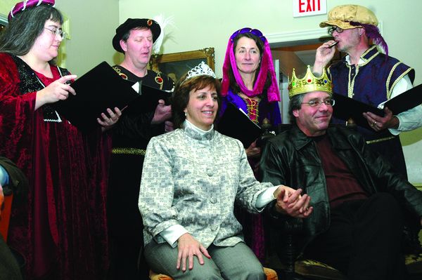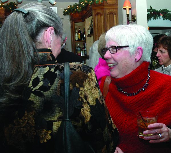 Anne Myers and Susan Sagendorf share some holiday cheer.