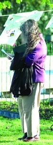 A woman reads the program in front of the Clothesline Project.