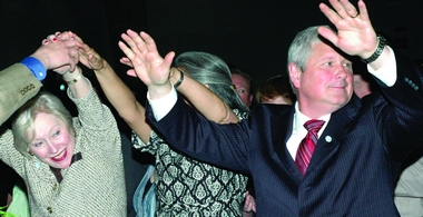 SUNY's Nancy Zimpher and Mike McCaskey form an arch.