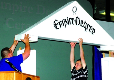 Workers set up the stage for the Empire Degree awards.
