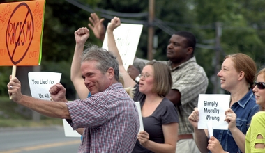 Protestors signal passing vehicles to honk.