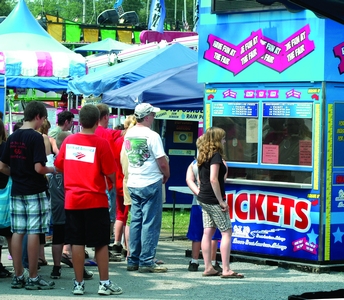 Fairgoers wait patiently in line for midway tickets.