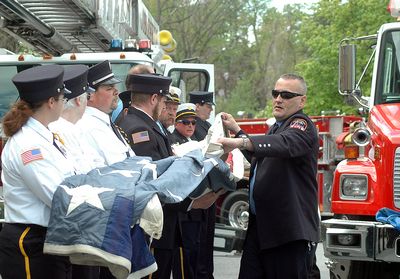 Firefighters hold the 9/11 flag as NYC firefighter Jimmy Sands unwraps it.